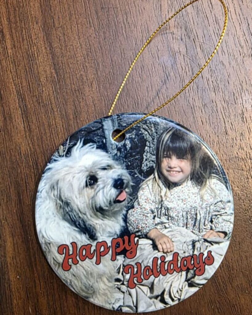 Celebrate the season with this charming 3-inch round ceramic ornament featuring a nostalgic holiday photo of a little girl and her fluffy dog, paired with cheerful “Happy Holidays” lettering.