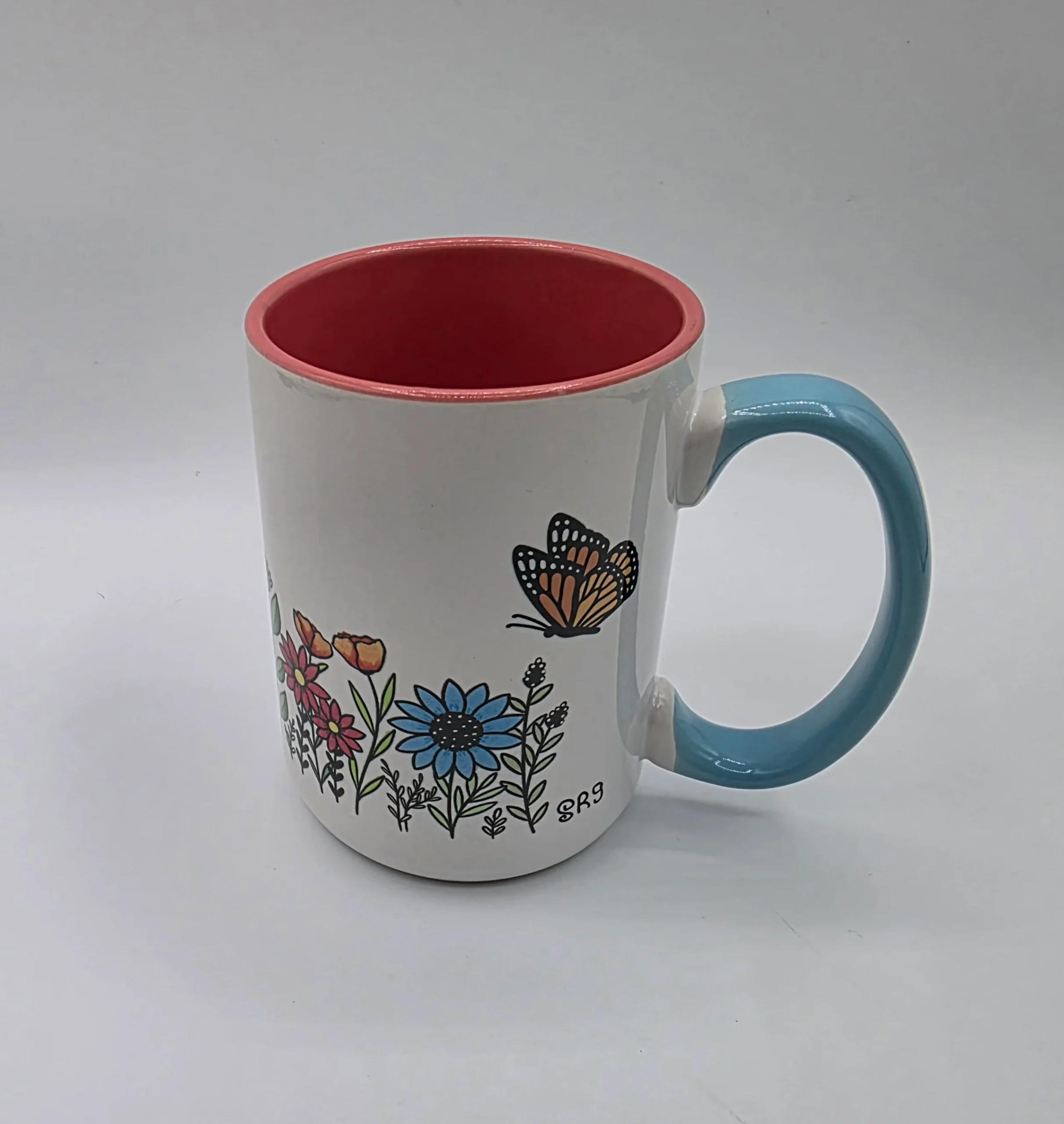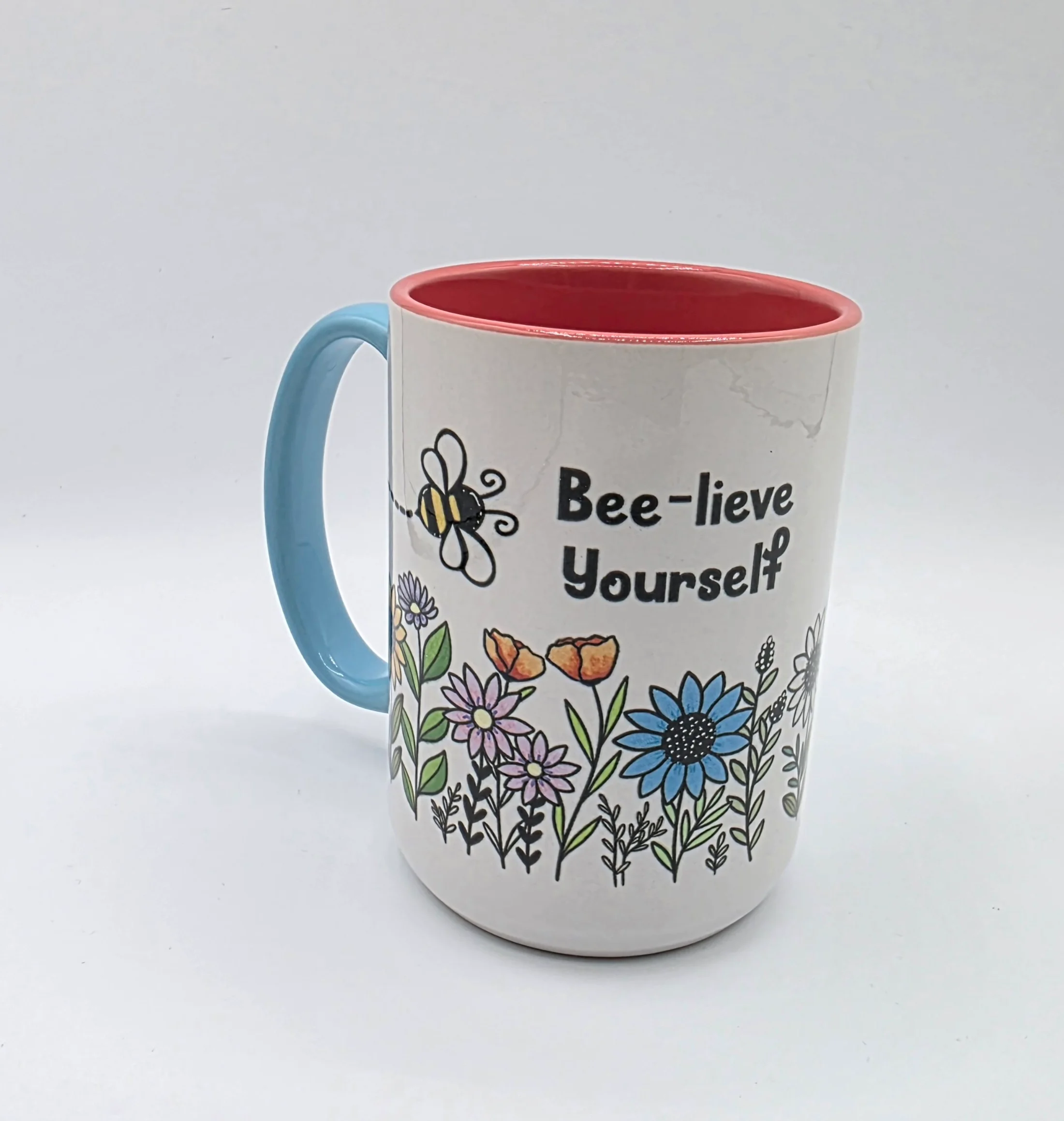 Beveled Ceramic mug with floral wrap around print and the inspiring message to Bee-lieve Yourself. 15 fluid ounce mug. Dishwasher and microwave safe. BPA Free. Non-toxic.