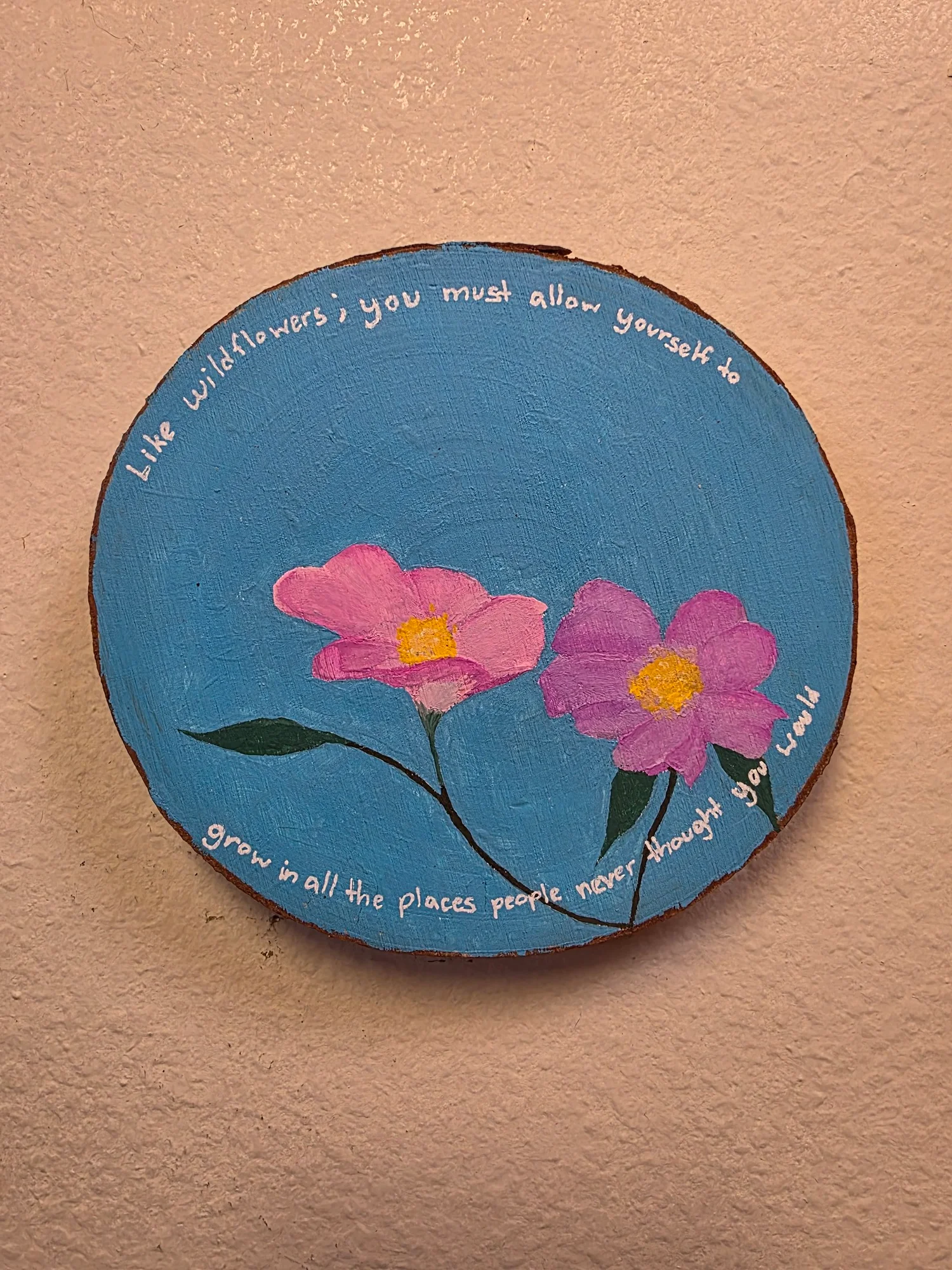Painting features pink Evening Primrose an exceptionally hardy wildflower capable of growing in rock gardens and sidewalk cracks, often thriving in poor, sandy, or rocky soil. It is drought tolerant and often pops up in unexpected places. The words Like wildflowers, you must allow yourself to grow in all the places people never thought you would remind us that some journeys take us places we never expected to be.