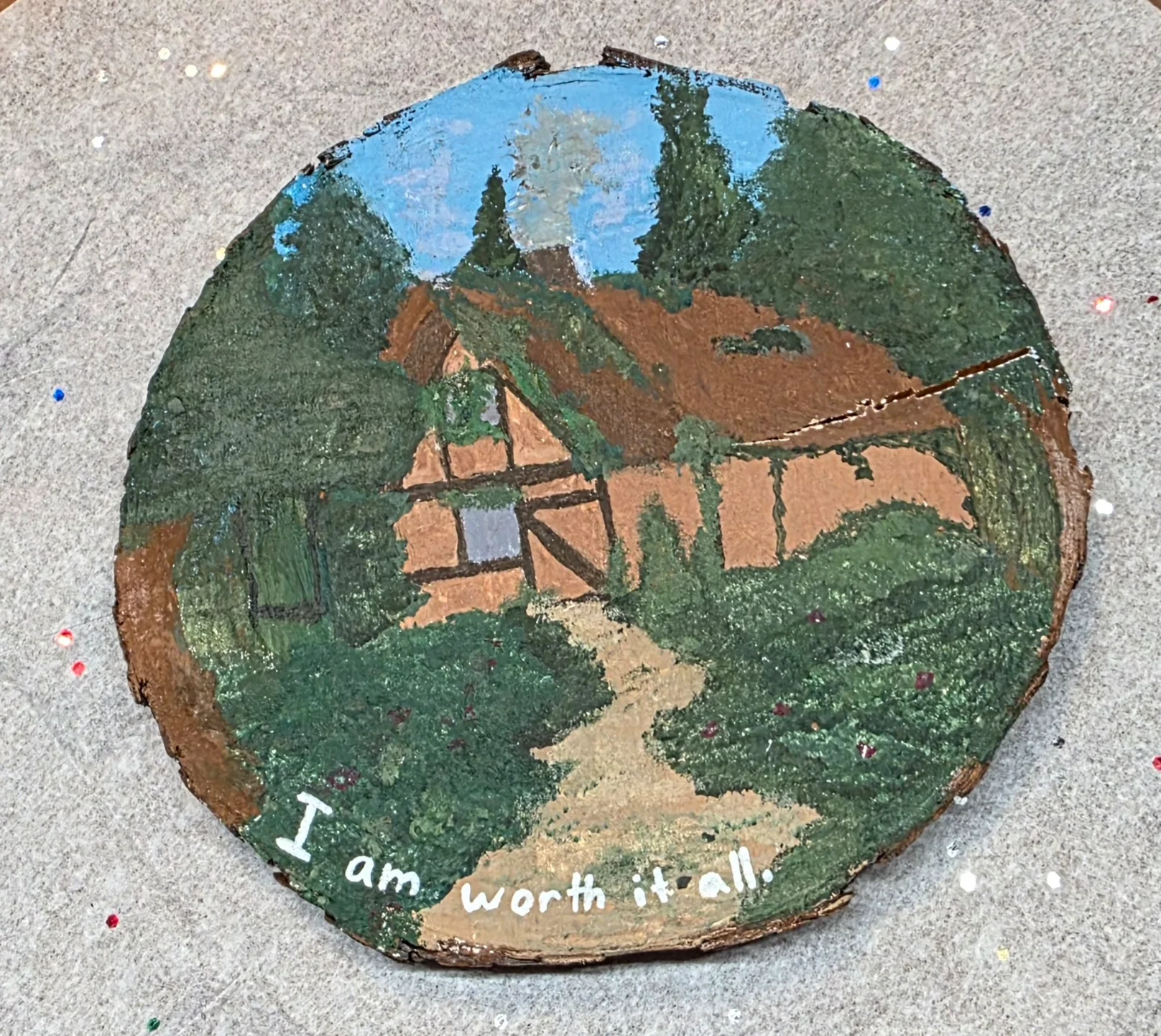 Painting features a cottage in pine trees.  A symbol of strength and value. Words I am worth it all is a reminder that we all have value and deserve good things.